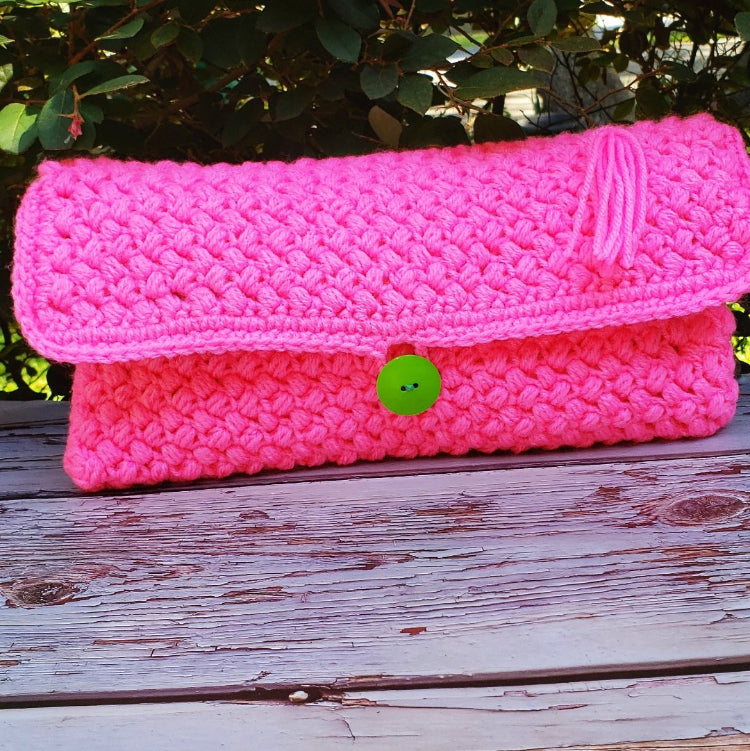 Cartera de ganchillo Hot Pink Clutch, original y única cartera de mano para regalar en una ocasión especial.